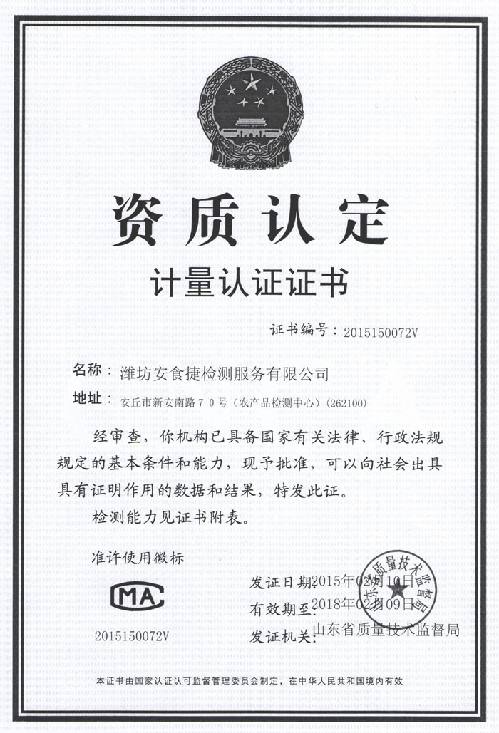 2015年2月,魯豐集團(tuán)組建的第三方檢測中心——濰坊安食捷檢測服務(wù)有限公司獲省質(zhì)監(jiān)局計量認(rèn)證,是該公司繼中國合格評定認(rèn)可委員CNAS認(rèn)可后的榮獲的又一資質(zhì)。