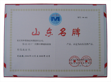 公司生產(chǎn)的"魯豐"牌速凍面食產(chǎn)品榮獲"山東名牌產(chǎn)品"稱號(hào)!