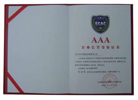 公司被山東省企業(yè)信譽(yù)評(píng)價(jià)工作委員會(huì)評(píng)為山東省AAA級(jí)信譽(yù)企業(yè)